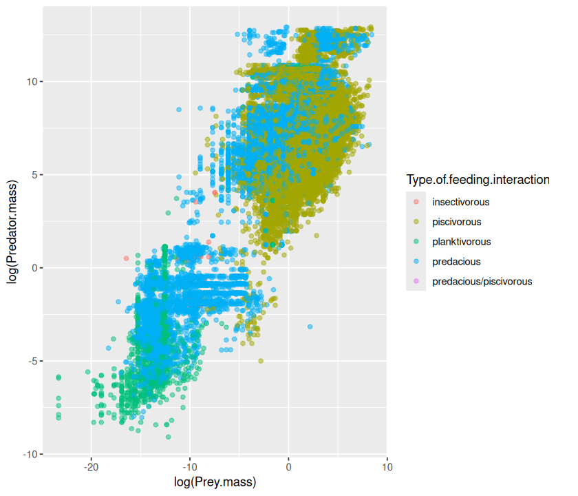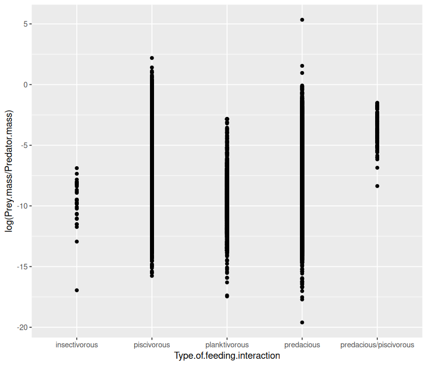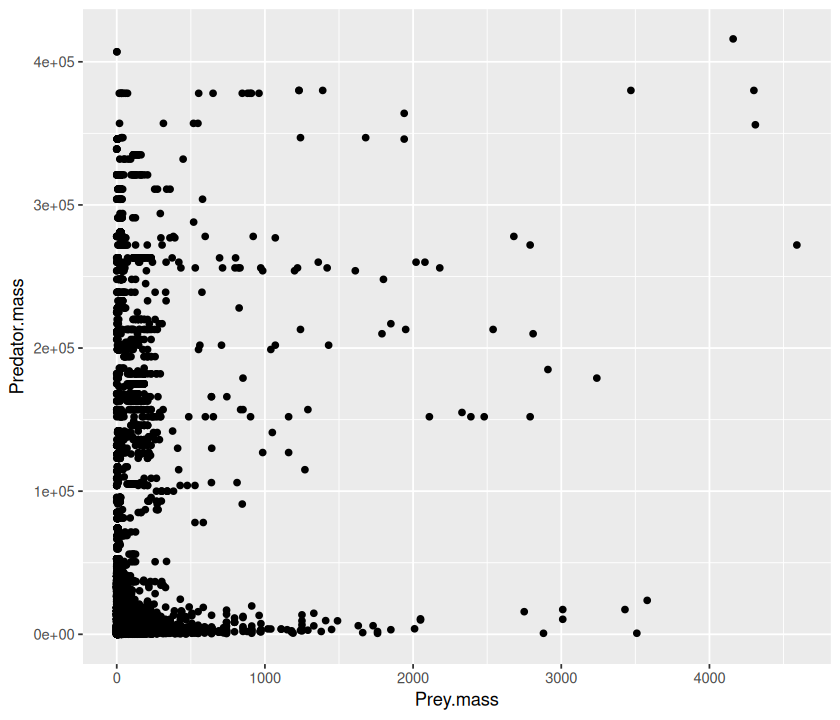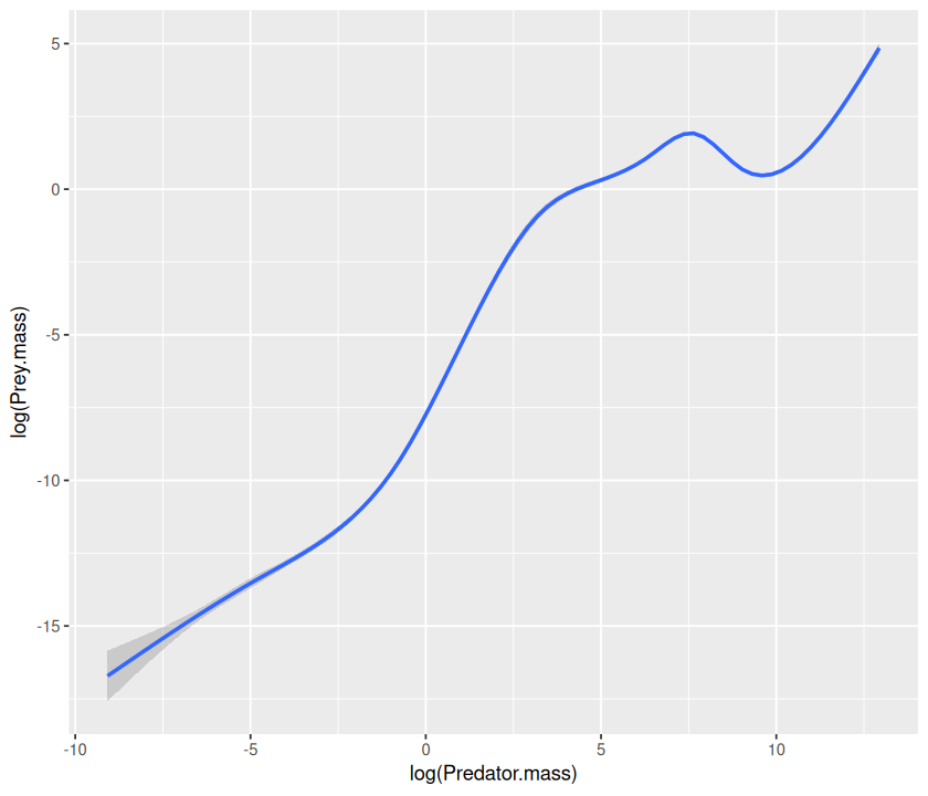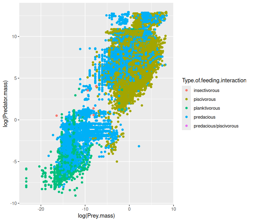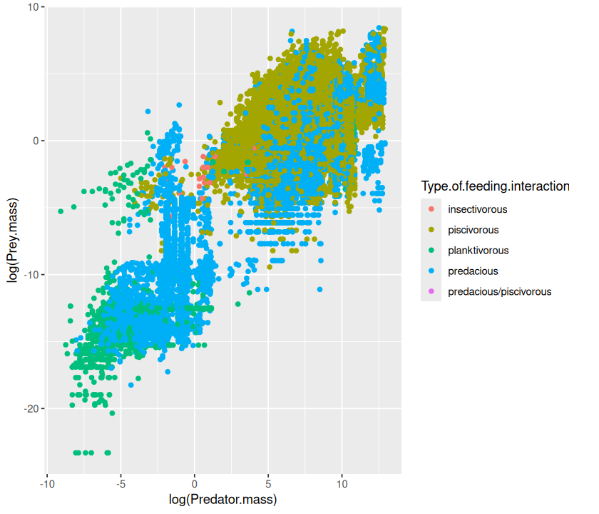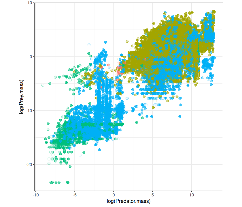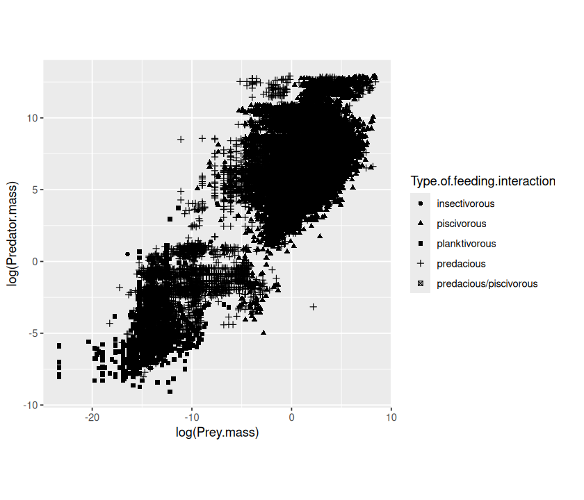 p <- ggplot(MyDF, aes(x = log(Predator.mass), y = log(Prey.mass),