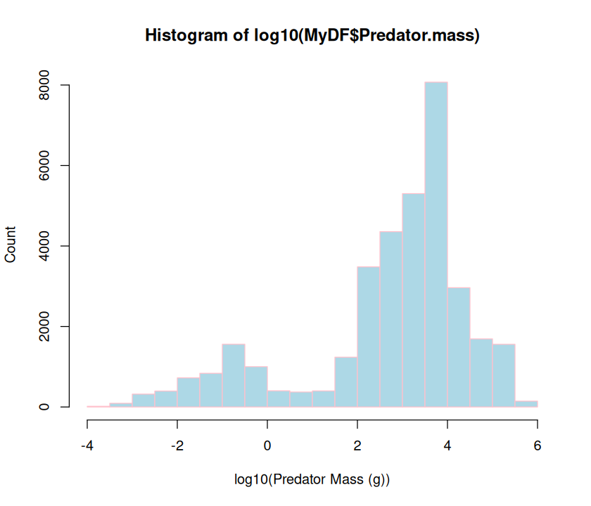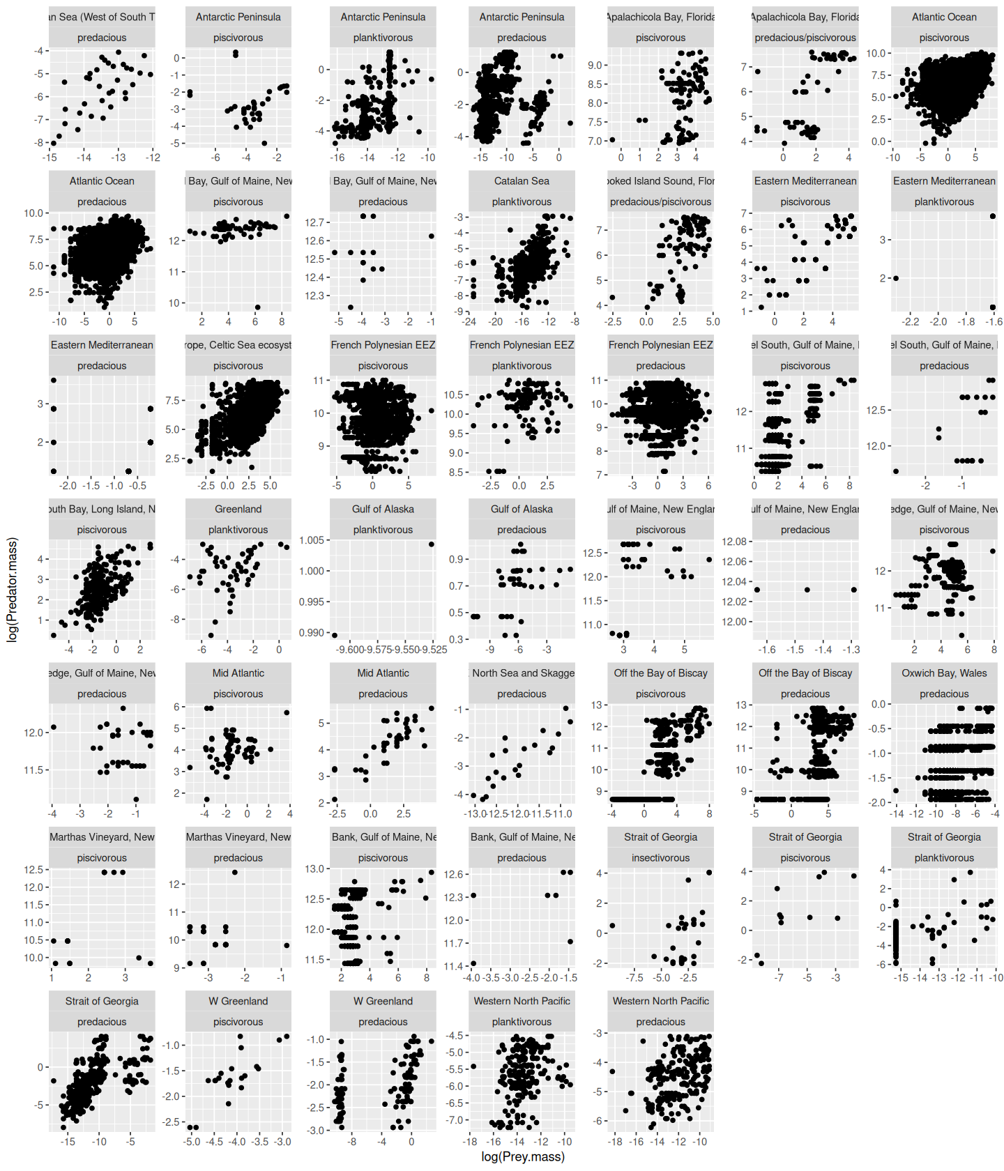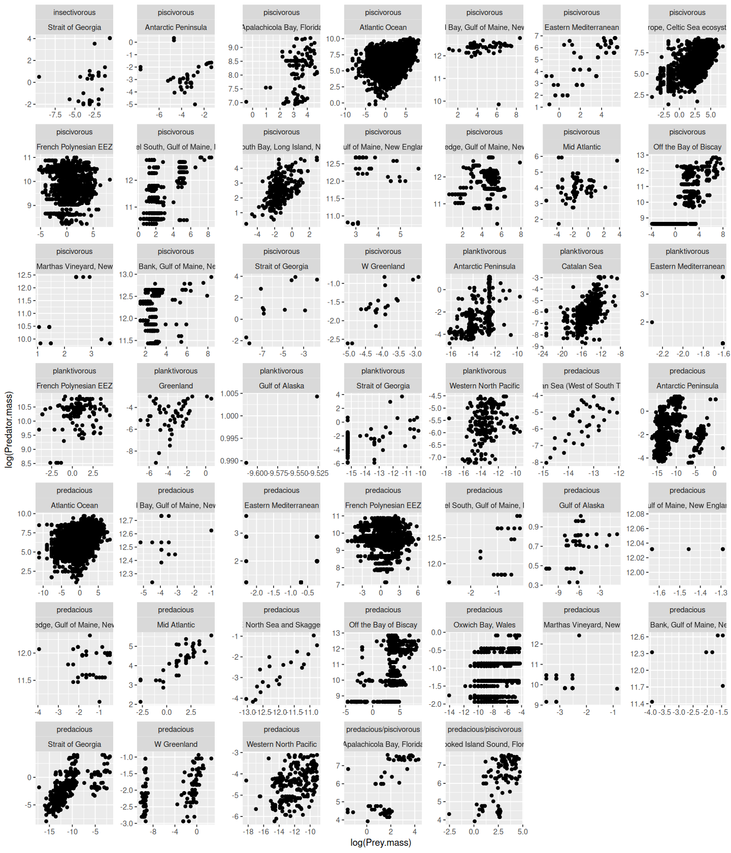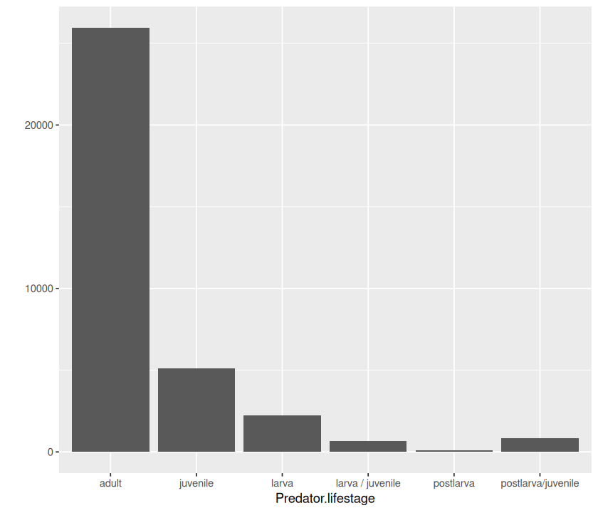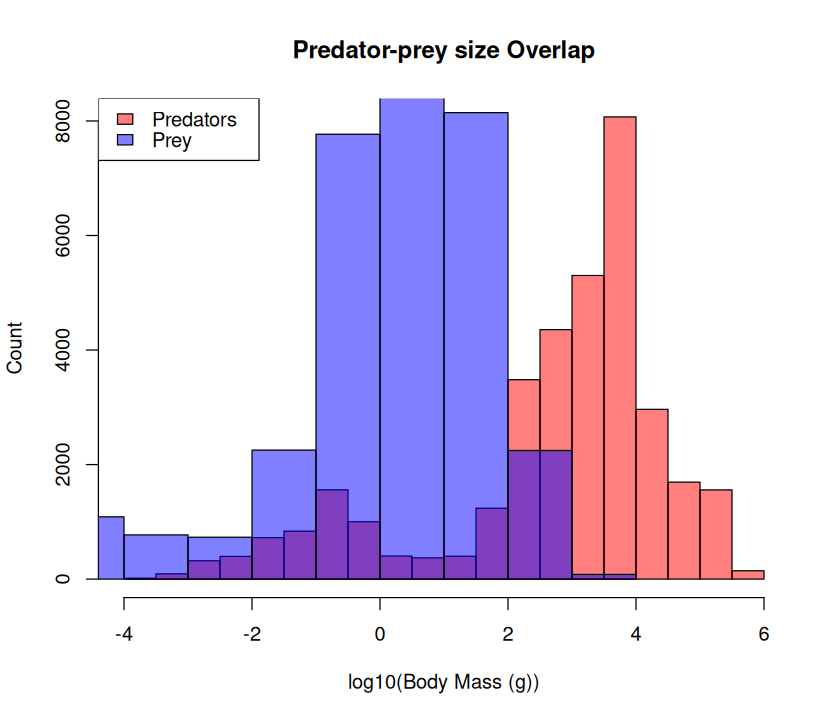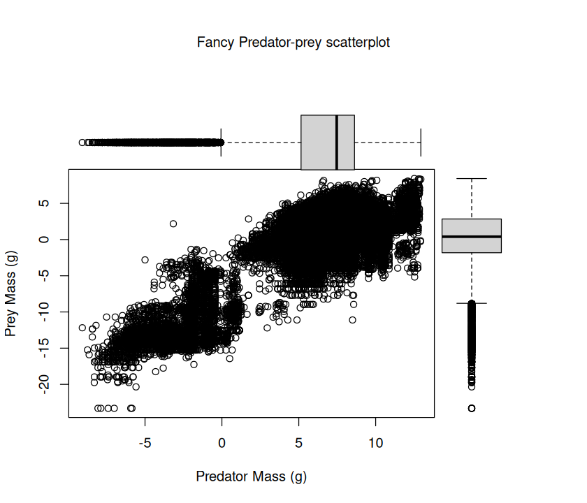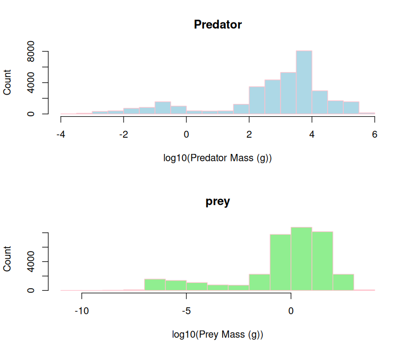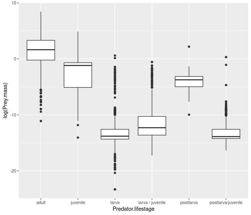 In this practical, you will write script that draws and saves a pdf file of the following figure, and writes the accompanying regression results to a formatted table in csv. Note that as the plot suggests, that the analysis must be subsetted by the Predator.lifestage field of the dataset.