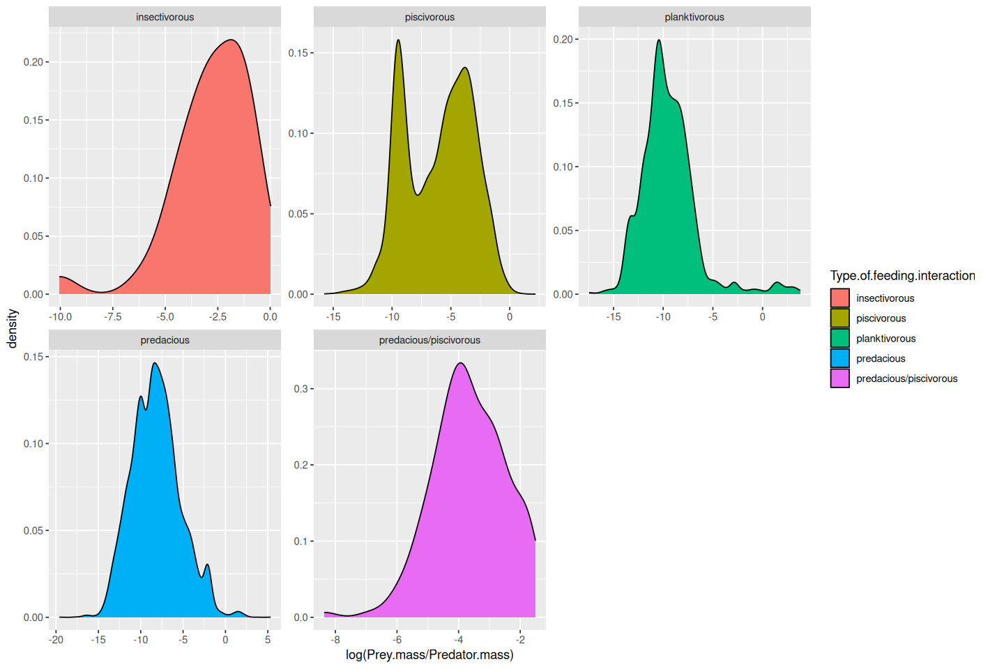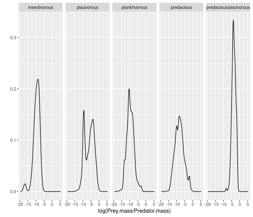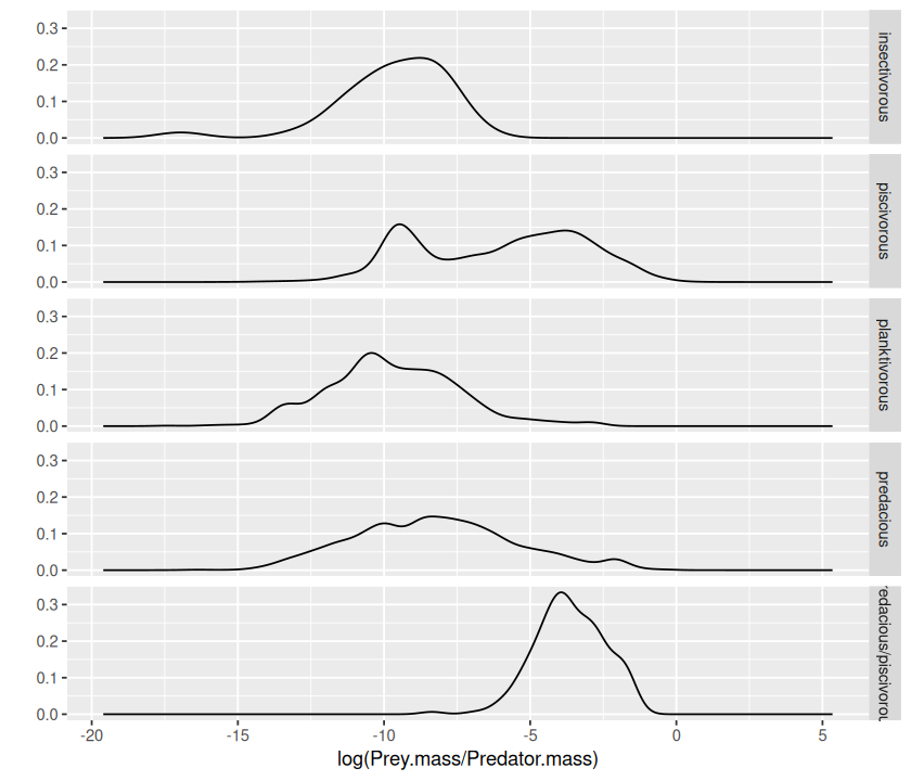PP_Regress_Results.csv), in theresultsdirectory. (Hint: you will have to initialize a new dataframe in the script to first store the calculations and thenwrite.csv()orwrite.table()it.)All that you are being asked for here is results of an analysis of Linear regression on subsets of the data corresponding to available Feeding Type \(\times\) Predator life Stage combination — not a multivariate linear model with these two as separate covariates!