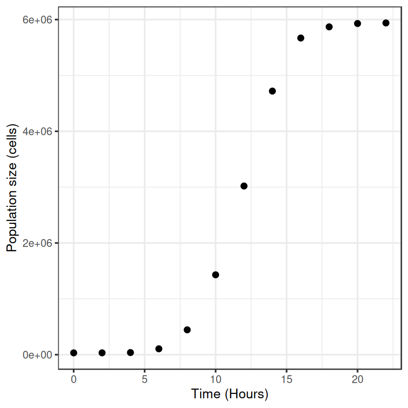 First off, lets make an example dataset of microbial popultion growth by cell counts which produces a plausible looking sigmoidal growth curve