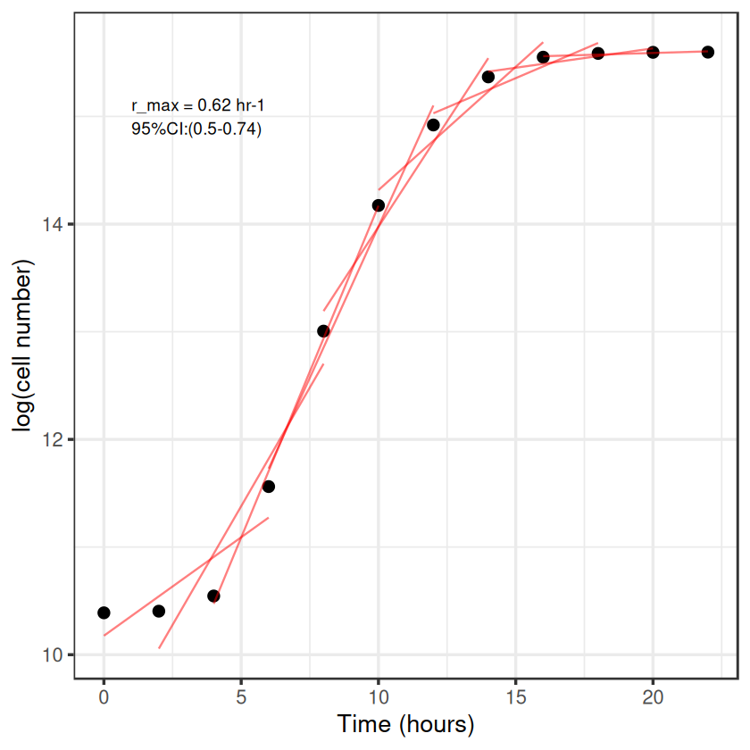 But this is still not great, we only estimated the exponential phase by eye, we could do it better by iterating through different windows of points, comparing the slopes and finding which the highest is to give the maximum growth rate, \(r_{max}\). This is called a rolling regression.