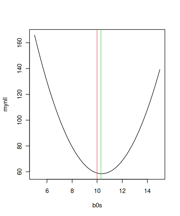 The TRUE value for b0 (10) is the red line, while the value that minimizes the log-likelihood (i.e., maximizes the negative log-likelihood) is the green line. These are not the same because maximum likelihood is providing an * estimate * of the TRUE value given the measurement errors (that we ourselves generated in tgis synthetic dataset).