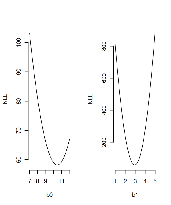 That is, we calculate the negative log-likelihood for fixed b1, across a range (5 - 15) of b0.